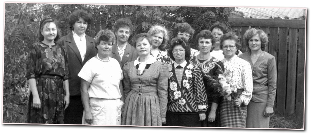 1-й ряд (слева направо): Г.С. Ковязина, Н.Д. Жукова, Л.Н. Гончарова, Н.М. Перминова, В.С. Бастракова, Н.С. Мамаева; Педагогический коллектив у нас был сплочённый, ответственный, добросовестный. В наставниках старшего поколения я видела подлинную материнскую любовь к детям в сочетании с благоразумной строгостью. Любовь Алексеевна Вохминцева — учитель начальных классов. Умная, выдержанная, с приветливой улыбкой на лице. Михаил Павлович Долгушев — учитель труда. Душа-человек, всегда готовый придти на помощь любому сотруднику. Его уважали и любили как дети, так и коллеги. Эти педагоги приходили в школу в хорошем настроении, являясь примером для одних и утешением для других. Ведь люди, которые достигли внутреннего спокойствия, всегда привлекательны и любимы. В школе учились разные по состоянию здоровья дети, и к сердцу каждого надо было найти ту единственную тропиночку, что приведёт к успешному обучению и воспитанию. Приоритетом в деятельности педагогов всегда была и остаётся любовь к воспитанникам, без неё в «особом» учебном заведении работать невозможно. Мой первый незабываемый класс. Навсегда останутся в памяти выпускной вечер, который длился до утра, проводы на автостанции и слёзы расставания. Какими чистыми, добрыми и старательными были мои первые ученики! Как искренни мы были, Как верили всему, И были мы верны Добру лишь одному. Приведу лишь один пример. Когда прошлым летом из Мариуполя приехал изменившийся до неузнаваемости выпускник школы Владимир Соломин, потерявший только что построенный двухэтажный дом, самую существенную помощь ему оказали одноклассники. С хорошим чувством вспоминаю последний класс, в котором вела уроки русского языка и литературы. Классным руководителем там была Валентина Георгиевна Софронова — умный, строгий, знающий педагог. Дети её очень уважали. Также я работала с Валентиной Константиновной Чеботаевой, которая отличалась внутренней культурой, интеллигентностью, прекрасными знаниями русского языка и литературы. Валентина Сергеевна Бастракова — понимающая, порядочная, исполнительная. И нет ничего бесценнее, чем беседа с умным человеком, который по-хорошему воспринимает тебя и желает тебе только добра. Валентина Ивановна Козицына, Тамара Фёдоровна Кошкина, Нина Сергеевна Мамаева олицетворяют наших простых русских женщин — заботливые, чуткие, трудолюбивые. Быть отзывчивым в наше время и сохранять это нравственно-духовное качество при любых обстоятельствах — всегда достойно. Когда мы с В.И. Козицыной возвращались домой, то не могли наговориться о планах нашей работы, и путь нам казался очень коротким. Валентина Ивановна подарила школе 47 лет работы с детьми. Ребята её любили, как родную маму. Алевтина Анатольевна Домрачева — женщина ответственная, старательная, добрая. В школе работает 50-й год, со вниманием относится к пенсионерам. Галина Сергеевна Ковязина. В ней я отмечаю собранность, точность, правдивость. Она ценила своих учеников, умела исправлять их неуместные поступки, стремилась направить энергию ребят на достижение положительных результатов. С приходом в школу директора Нины Михайловны Перминовой и завуча Ольги Васильевны Ждановой жизнь в учреждении просто закипела. Была создана атмосфера творчества, сотрудничества, направленная на достижение высоких результатов во всём.