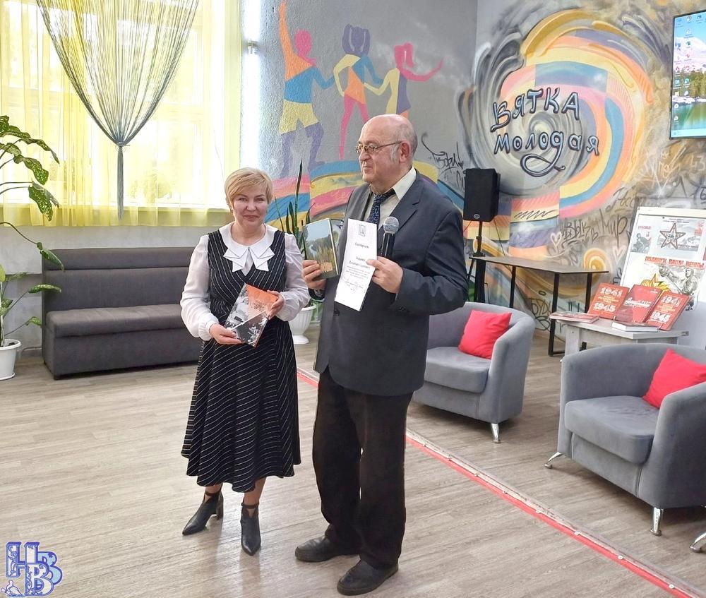 В этом году, объявленном президентом Годом защитника Отечества, и в год 80-летия Великой Победы особенно актуально изучать историю, связанную с периодом Великой Отечественной войны, заполнять пробелы, передавать потомкам историческую правду. Ведь эта война внесла коррективы не только в жизнь каждой семьи, живущей в России, но и в жизнь целого государства. 21 мая 2025 года в «Отличном месте» районной библиотеки им. П.В. Алабина прошла презентация книги Владимира Жаравина «Эвакуированные в 41-42-м». Презентацию проводил сам автор. И это была не просто встреча автора с читателями, а настоящее путешествие во времени. Все мы знаем, что Кировская область в годы ВОВ была одним из центров эвакуации заводов, фабрик, организаций и людей из разных регионов страны. Кировская область стала «страной спасённого детства», приняв более 28 тысяч детей из Ленинграда и Ленинградской области. Эвакуировались и высшие учебные заведения вместе со студентами. Мировая история не знает больше такой эвакуации, которая была организована в годы войны. Учёные умы до сих пор изучают этот феномен. Ведь с запада на восток нашей огромной страны было эвакуировано около 1500 предприятий и около 16 миллионов человек, что равняется численности населения среднего европейского города. Чтобы перевезти один завод, требовалось 2 тысячи вагонов и 10 тысяч человек. Но самый глобальный вопрос надо было решать с размещением такого количества оборудования и людей на новом месте. Уже 24 июня 1941 года правительство, уверенное, что победа в любом случае будет за нами, начало организованную эвакуацию высших учебных заведений. Все были заинтересованы в том, чтобы вузы работали и продолжали выпускать высококлассных специалистов. В Кировскую область прибыло 10 образовательных учреждений. Именно тему эвакуации высших учебных заведений и взял для исследования и написания книги Владимир Жаравин.