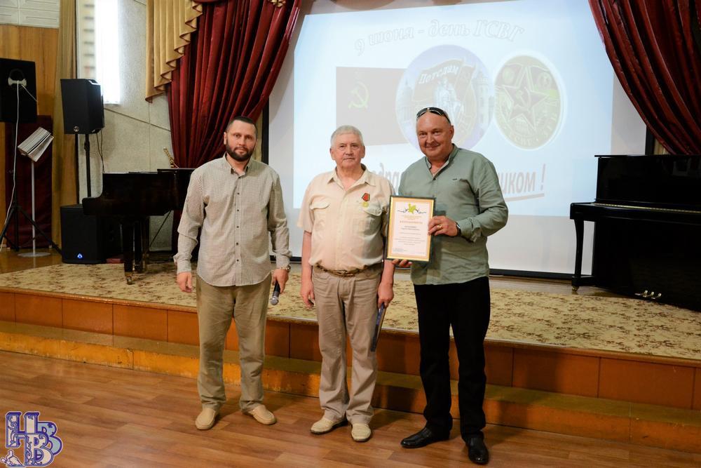 Присоединился к поздравлениям Иван Николаевич Ефремов – творческий человек, ветеран ГСВГ. Под дружную поддержку зала он прочитал несколько стихов собственного сочинения. Затем слово предоставили главе администрации города Советска Валерию Анатольевичу Недопёкину. Он рассказал о том, что в ГСВГ брали только лучших. Люди, сидящие в зале, с честью отдали свой долг Родине, а впоследствии занимали достойные места в обществе. Благодарственным письмом были награждены Владимир Александрович Злобин, Сергей Александрович Малков, Владимир Геннадьевич Храмых, Николай Михайлович Коснырев, Александр Иванович Мансуров, Василий Степанович Смоленцев, Николай Анатольевич Плишкин, Юрий Игоревич Полушин за активное участие в работе общественных организаций и в связи с 80-летием образования ГСВГ. Ветераны принимали поздравления от председателя районной Думы Аркадия Михайловича Зубкова. Он вручил благодарственные письма от лица Законодательного собрания за активную жизненную позицию, патриотизм и поддержку военнослужащих, принимающих участие в СВО, Александру Ивановичу Патрушеву, Владимиру Ивановичу Порубову, Сергею Николаевичу Полушину, Андрею Николаевичу Пирогову. Тем, кто не дожил до сегодняшнего дня, чьи имена вписаны золотой нитью в историю России, была посвящена песня «Бессмертный полк» в исполнении Карины Богомоловой. Ветераны ГСВГ были награждены памятными юбилейными медалями за вклад в защиту интересов страны в условиях непростой геополитической обстановки. По поручению генерала Валерия Александровича Меньшикова Станислав Арсентьевич был награждён юбилейной медалью «70 лет космодрому Байконур».