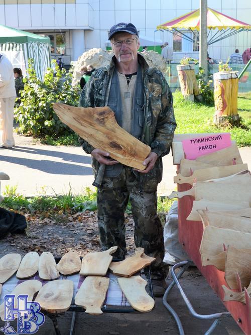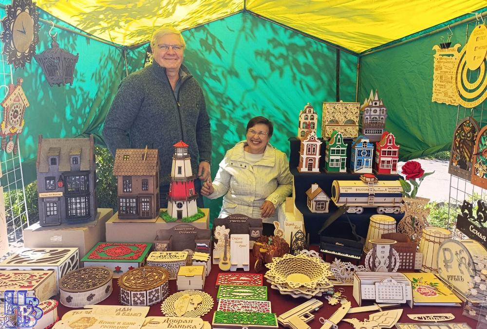 В этом году организаторы сознательно сделали ставку на товары собственного производства и рукоделие, превратив улицу Ленина в огромную выставку-продажу народных талантов. Почти каждая палатка была порталом в мир увлечений её хозяина. Радостно, что каждый год прибывают на нашу традиционную ярмарку новые купцы-продавцы, создавая здоровую конкуренцию местным мастерам. Екатерина Савиных приехала из Кирова и привезла изделия из бумажной соломки: «Занимаюсь я этим не так давно, примерно год. Случайно увидела в интернете такие вещицы и загорелась идеей попробовать сделать самой. Всегда любила рукодельничать. Сейчас дорабатываю свою страничку во «ВКонтакте», где буду демонстрировать изделия, а понравившееся можно будет заказать. Сообщество решила назвать «Уютный дом», так как считаю, что уют кроется именно в таких милых мелочах вокруг нас. Сидеть за столом с ажурными салфетками, конфетницами, сухарницами и пить чай – это же так здорово! На каждое изделие уходит разное количество времени, за работой забываешь обо всём. Процесс очень интересный! Своими руками превращаешь простую бумагу в красивые предметы. А как радуются друзья таким подарочкам! Делаешь с любовью, даришь своё тепло». Юрий Иванов из Йошкар-Олы удивил покупателей необычными поделками из дерева, сделанными с помощью лазерной резки: «Сувениры я изготавливаю уже восьмой год. Для меня это работа, так как я ещё не на пенсии. Оформлен, как самозанятый. Всё мы делаем вместе с женой, дети помогают: дочь – дизайнер, зять – программист. Некоторые изделия – полностью наша разработка. Например, домик Хоббита, которого в Советске, к сожалению, не было в продаже: накануне его купили. Вот именно это изделие готовится 2-3 дня. Много изделий продаём через магазины на Озон, Яндекс.Маркет, в группе во «ВКонтакте» «Поделкино». Если что понравится, можно заказать по телефону, вышлем по адресу».