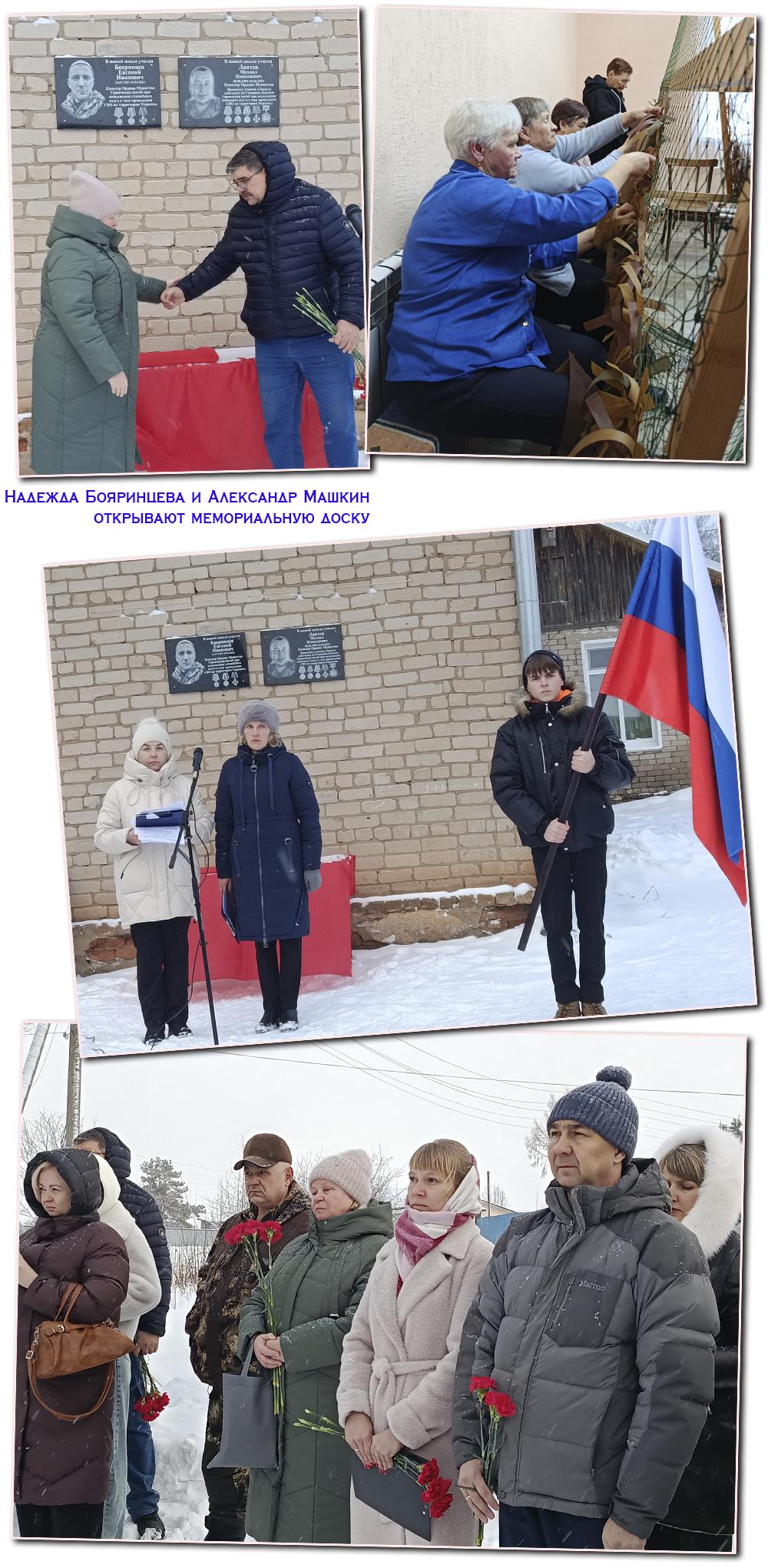 В этот день памятные тетради были вручены мамам погибших бойцов, Галине Модестовне Лаптевой и Надежде Густавовне Бояринцевой, с последующей передачей детям. В зале стояла тишина, которая была красноречивее любых слов. Кульминацией этого памятного дня стало открытие мемориальных досок на здании Обуховской школы. Событие со слезами на глазах... Здесь собрались родные героев, педагоги, ученики, представители власти, руководители района и села. Каждый из выступающих, вспоминая погибших, говорил о них не как о героях из сводок, а как о близких людях, чей подвиг останется в памяти навсегда. Евгений Бояринцев погиб 10 апреля 2024 года в возрасте 36 лет. Он был награждён медалями «Участник миротворческой операции», «За участие в миротворческой миссии в Нагорном Карабахе». Михаил Лаптев, призванный на службу в 2022 году, погиб 15 июня 2024 года в 39 лет. Награждён медалями «За отвагу», «За воинскую доблесть» II степени. Оба отдали жизни, выполняя воинский долг, и оба посмертно удостоены ордена Мужества. Впереди – установка на здании школы ещё одной мемориальной доски в память о Вадиме Николаевиче Царегородцеве, погибшем 7 ноября 2024 года. Когда церемония подошла к завершению, к мемориальным доскам потянулись люди. В руках – живые гвоздики. Их было много: красные, свежие, напоминающие о потерях. Цветы ложились к подножию досок один за другим – молча, без слов, как знак общей памяти, общей скорби и глубокой благодарности. Моё внимание привлекли школьники, участвовавшие в церемонии. Несмотря на мороз, все они держались стойко. А два мальчика, с флагами в руках, стояли серьёзные, сосредоточенные, с почти солдаткой выправкой. Смена героям растёт настоящая, достойная!