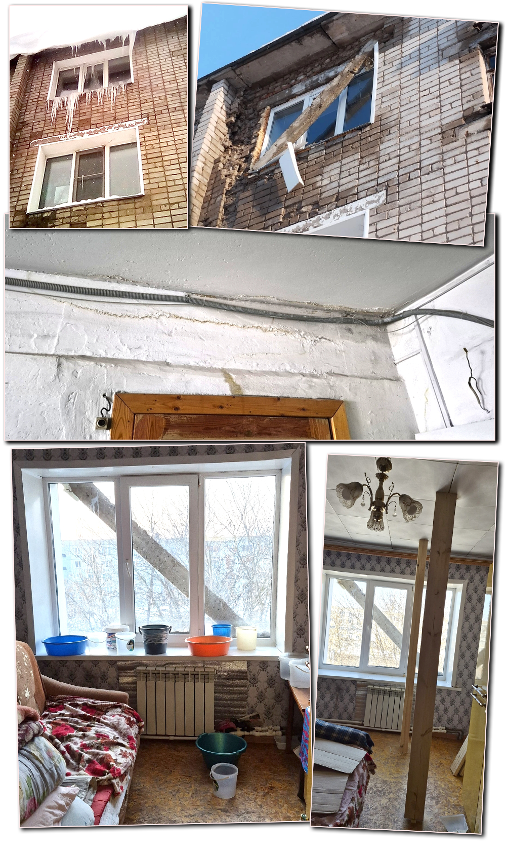 Наступлению весны радуются далеко не все. Таяние снега и оттепель нередко приводят к протечке кровли, проникновению воды в жилище, причинению ущерба имуществу его владельцев. Зачастую жители испытывают не только коммунальные неудобства, но и страх обрушения крыши, стен, всего дома, боятся за свою жизнь и жизнь близких. Хозяевам частных домовладений решать проблемы с ремонтом проще, так как они сами определяют, когда и какие проводить работы, выполнять их своими силами или обращаться к специалистам, сколько средств вложить. В многоквартирных домах большинство ремонтных работ ложится на плечи управляющей компании или ТСЖ, а их проведение зависит от многих факторов: региональной программы капремонта, активности или пассивности собственников помещений, уровня их благосостояния, своевременной уплаты взносов на ремонт общего имущества, отношений между жильцами и пр. Поэтому не все проблемные вопросы решаются так, как нужно. Это в советское время практически все многоквартирные дома были муниципальными, и местные власти несли ответственность за их содержание и ремонт. Приватизировав квартиру в МКД, граждане не только обзавелись личным жильём, но и согласно законодательству взяли на себя обязательства по содержанию общедомового имущества: крыши, стен, фундамента, подвала, лестниц, коридоров, подъездов, систем инженерного обеспечения, земельного участка и др. К сожалению, не все это понимают, думают только о своих интересах. В многоквартирном доме решения должны приниматься сообща, поэтому важно посещать общие собрания, учиться взаимодействовать с теми, кто проживает рядом, договариваться с ними. Не зря говорят, что сила – в единстве. В Советске немало многоквартирных домов, которые просто кричат о помощи. Среди них трёхэтажный кирпичный дом №53 по ул. Энгельса – бывшее общежитие камнеразработок, построенное в 1987 году. Здание, в котором сейчас размещается более 40 квартир, рушится на глазах. Проблема жильцами не замалчивается, но не решается уже несколько лет. В текущем году обильный снег и перепады температуры усугубили обстановку: многочисленные протечки кровли привели к отслоению и размытию штукатурки, намоканию перекрытий и стен, их разрушению. Так, вечером 12 марта начала рушиться стена одной из квартир на верхнем этаже дома, в целях безопасности хозяйка была вынуждена покинуть своё жильё. Хорошо, что было куда съехать. Около 19:00 дочь женщины-пенсионерки сообщила о случившемся в ЕДДС. Вскоре ей перезвонили и сказали, что главы города и района проинформированы, прибудут на место к 10:00 следующего дня. 13 марта в 9:00 бывшее общежитие посетила комиссия, состоящая из представителей городской администрации (и.о. главы, архитектор), прокуратуры и подрядчика. Даже осмотр дома снаружи позволил зафиксировать проблемные участки, требующие срочного проведения ремонтно-восстановительных работ. Днём того же дня ситуация ухудшилась: произошло частичное обрушение намокшей кирпичной кладки и оконной перемычки, пострадало обрамление пластикового окна.