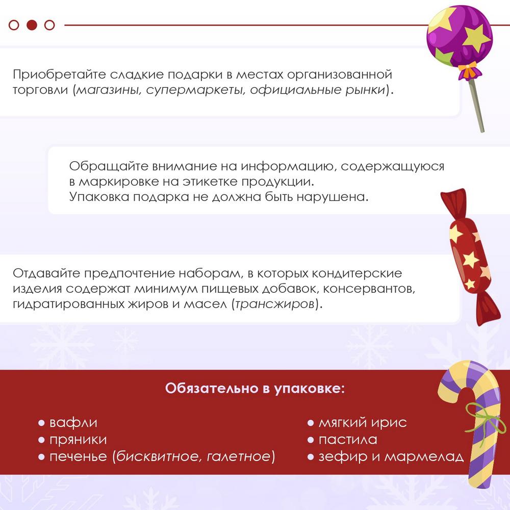 В преддверии Нового года Управление Роспотребнадзора по Кировской области напоминает, как выбрать сладкий новогодний подарок. Важно внимательно отнестись к выбору сладостей и придерживаться нескольких правил для того, чтобы приобрести вкусный, качественный и безопасный сладкий подарок. Сладкие новогодние подарки рекомендуется приобретать в местах организованной торговли (магазины, супермаркеты, официальные рынки).