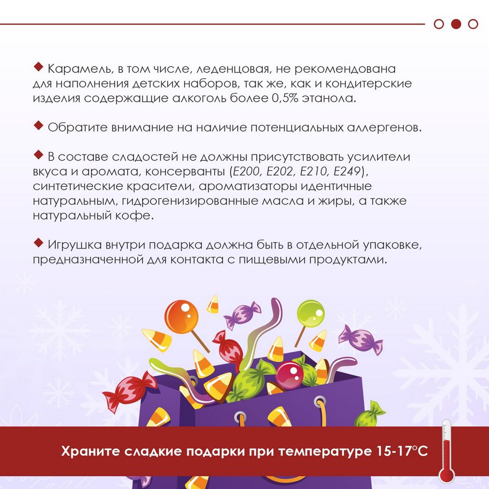В составе сладостей не должны присутствовать усилители вкуса и аромата, консерванты (Е200, Е202, Е210, Е249), синтетические красители, ароматизаторы идентичные натуральным, гидрогенизированные масла и жиры, а также натуральный кофе. Допускается содержание натуральных красителей и ароматизаторов. Внутри подарка вместе с кондитерскими изделиями может находится игрушка, она должна быть в отдельной упаковке, предназначенной для контакта с пищевыми продуктами. Важно помнить о возрастных ограничениях и технике безопасности. Игрушки для детей до 3 лет не должны содержать натуральный мех и кожу – это достаточно сильные аллергены. Также игрушка не должна содержать стекла и других бьющихся материалов, мелких деталей, в том числе, размер которых во влажной среде увеличивается более чем на 5%. Сладкий подарок необходимо хранить при температуре 15-17 градусов, иначе из-за нарушений условий хранения шоколад может покрыться белым налетом. По вашему требованию продавец подарка обязан предоставить декларации о соответствии, подтверждающие качество и безопасность всех составляющих компонентов подарка. В случае, если возникли сомнения относительно качества и безопасности сладких подарков, а также детской одежды, обуви и игрушек, вы можете обратиться за разъяснениями в территориальные органы Роспотребнадзора по субъекту Российской Федерации. | |