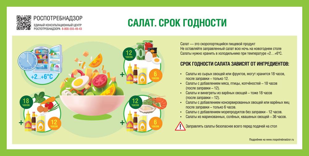 Одним из главных блюд на новогоднем столе часто бывает салат. Разнообразие рецептов позволяет сделать праздничный стол вкусным и нарядным. Роспотребнадзор напоминает, что любой салат — это благоприятная питательная среда для развития патогенных и условно-патогенных микроорганизмов, которые способны продуцировать токсины. Салат, который неправильно хранился, может стать причиной тяжёлого пищевого отравления. В салатах обычно смешивают продукты с разной стойкостью хранения, поэтому срок годности салата будет зависеть от рецепта. К тому же, салаты часто заправляют майонезом или другим соусом, а это ускоряет процессы размножения микробов. Поэтому салаты относят к скоропортящимся пищевым продуктам, которые рекомендуется хранить в холодильнике при температуре +2…+6ºС. Сроки годности салатов регламентированы: ► Салаты из сырых овощей или фруктов, могут храниться 18 часов, после заправки — только 12. ► Салаты с добавлением мяса, птицы, копчёностей — 18 часов (после заправки — 12). ► Салаты и винегреты из варёных овощей — 18 часов (после заправки — 12). ► Салаты с добавлением консервированных овощей или варёных яиц после заправки — только 6 часов. ► Салаты с добавлением морепродуктов без заправки — 12 часов. ► Салаты из маринованных, солёных, квашеных овощей — 36 часов.